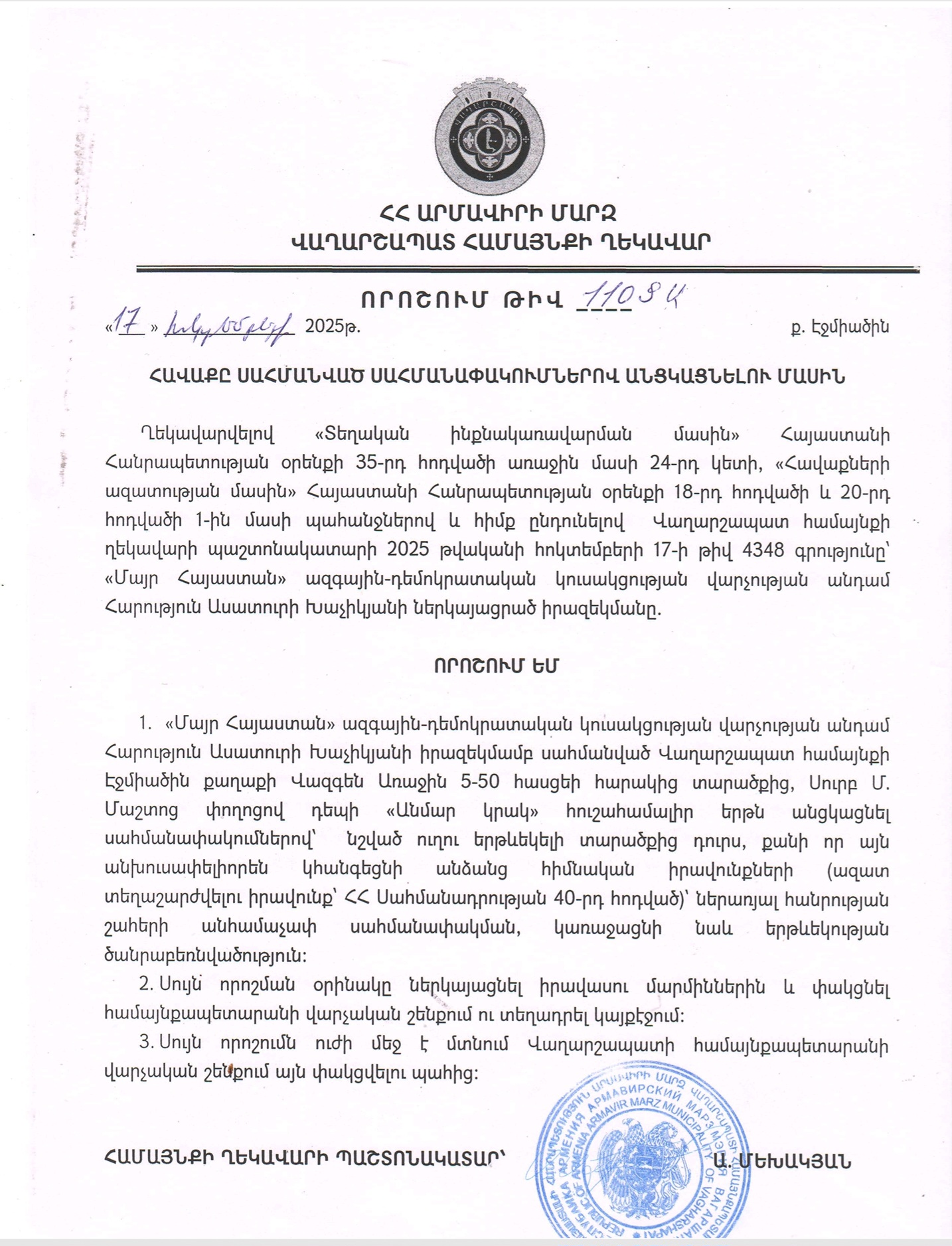 Ղեկավարվելով «Տեղական ինքնակառավարման մասին Հայաստանի Հանրապետության օրենքի 35-րդ հոդվածի առաջին մասի 24-րդ կետի, «Հավաքների ազատության մասին» Հայաստանի Հանրապետության օրենքի 18-րդ հոդվածի և 20-րդ հոդվածի 1-ին մասի պահանջներով և հիմք ընդունելով Վաղարշապատ համայնքի ղեկավարի պաշտոնակատարի 2025 թվականի հոկտեմբերի 17-ի թիվ 4348 գրությունը՝ «Մայր Հայաստան» ազգային-դեմոկրատական կուսակցության վարչության անդամ Հարություն Ասատուրի Խաչխկանի ներկայացրած իրազեկմանը.